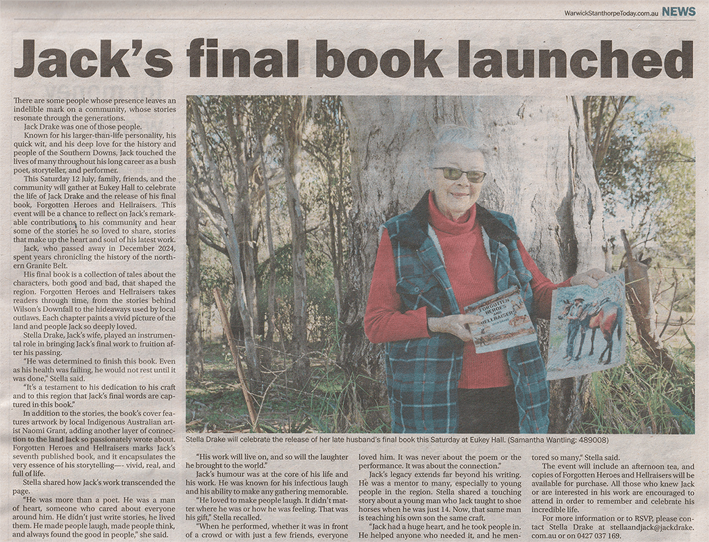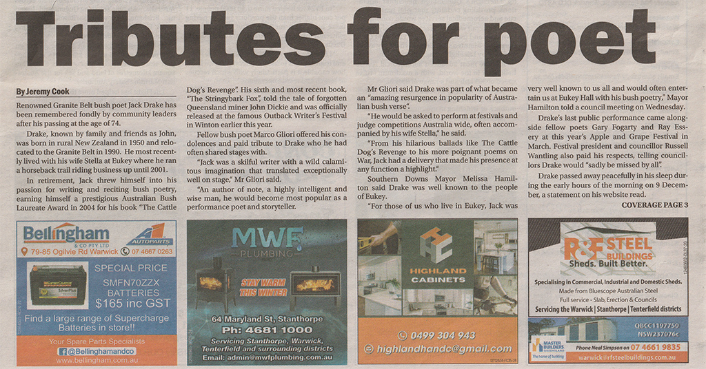 The local newspaper paid tribute to Jack’s passing in 2024, honouring his contributions to Australian Bush Poetry. He had a deep and lasting impact on the community, through which his warmth, humour, and infectious laughter brought joy to countless people and left an enduring mark on the bush poetry community and beyond.