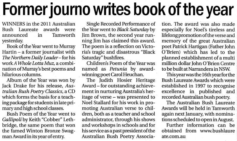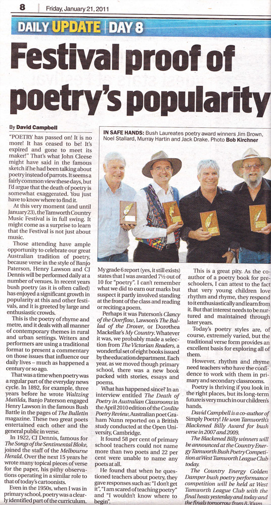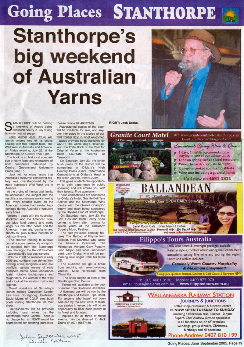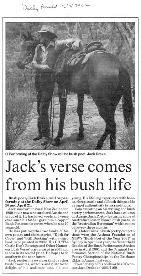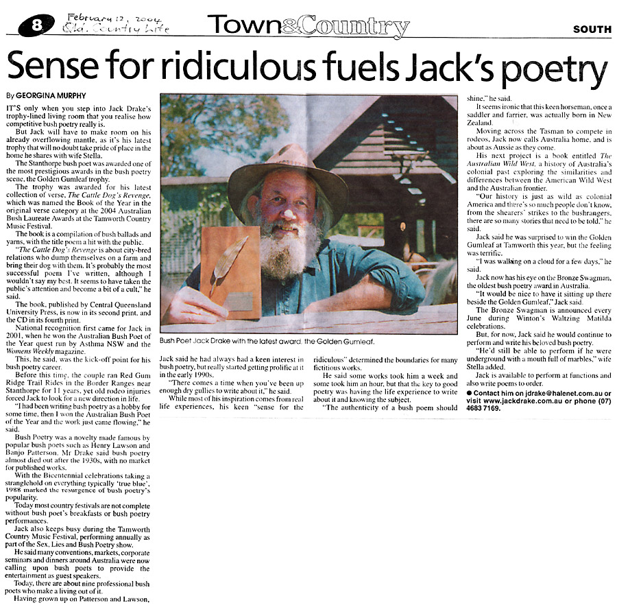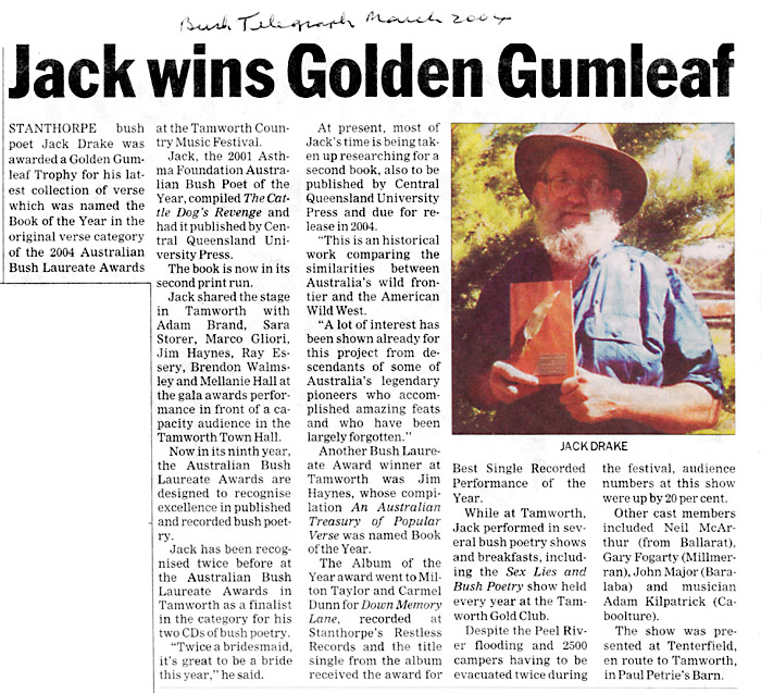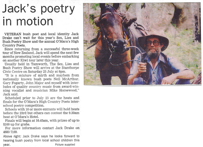 The local newspaper paid tribute to Jack’s passing in 2024, honouring his contributions to Australian Bush Poetry. He had a deep and lasting impact on the community, through which his warmth, humour, and infectious laughter brought joy to countless people and left an enduring mark on the bush poetry community and beyond.